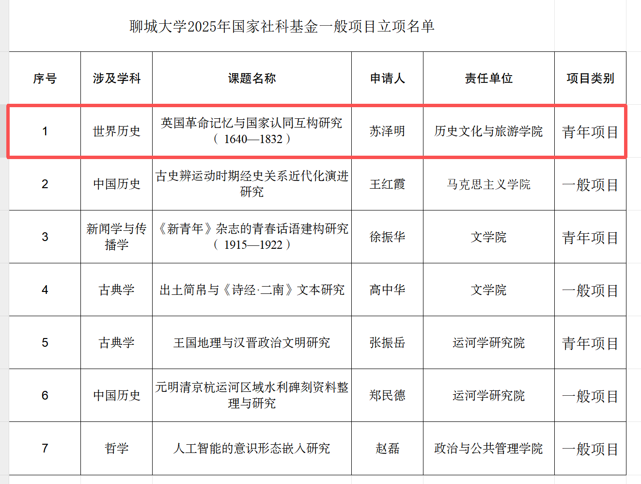 近日,全国哲学社会科学工作办公室发布了2025年国家社会科学基金年度项目立项名单,9728太阳集团教师苏泽明喜获立项。 近年来,历史文化与旅游学院高度重视国家社科基金项目申报工作,坚持以高质量发展为导向,以培育高水平成果为目标,持续推动科研工作稳步前行。下一步,9728太阳集团将以此为契机,深度挖掘优秀成果引领潜能,激发科研创新活力,助力9728太阳集团科研工作再上新台阶。