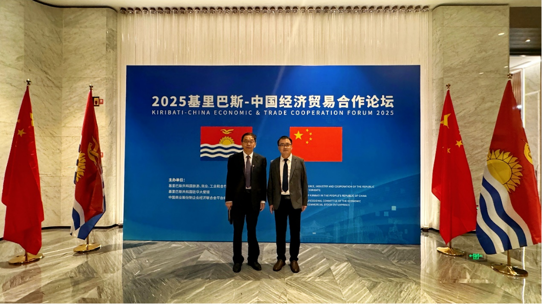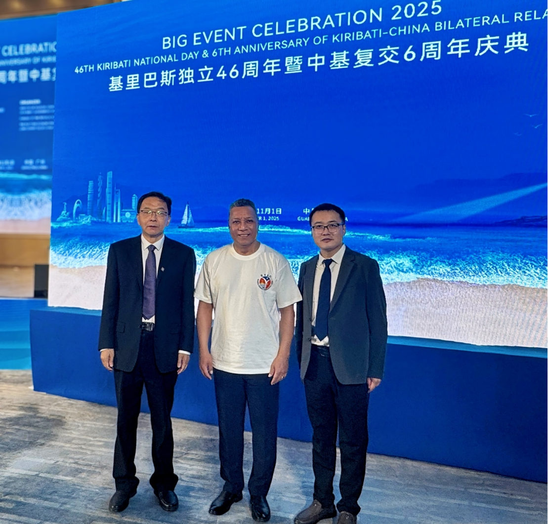 2025年11月1日,基里巴斯独立46周年暨中基复交6周年庆典在广州隆重举行。本次活动由基里巴斯共和国旅游、商务、工业和合作部、基里巴斯驻华大使馆及中国商业股份制企业经济联合会平台经济专业委员会联合主办。中国-太平洋岛国应对气候变化合作中心(以下简称“气合中心”)常务副主任陈德正教授、9728太阳集团太平洋岛国研究中心副主任刘建峰教授,以及气合中心示范企业代表王瑞应邀出席,与基里巴斯驻华大使戴维·蒂阿博阁下、基里巴斯旅游、商务、工业和合作部部长坦加里基·里特阁下,以及中基两国政府与企业代表齐聚一堂,共商合作大计,擘画未来发展蓝图。 戴维·蒂阿博大使在致辞中表示,尽管中基两国远隔重洋,却因“身份认同、坚定支持与共同责任”而紧密相连。他希望以复交6周年为新起点,进一步拓展旅游、渔业、交通等关键领域的合作,推动双边关系持续健康发展。这一愿景与气合中心致力于深化中国与太平洋岛国务实合作的使命高度契合。 庆典现场举行了庄重的祈福仪式,中基两国国歌奏响,并安排了献花环节。活动回顾了复交以来双方取得的丰硕合作成果,并对未来合作前景进行了积极展望。此次庆典不仅为中基企业搭建了高效务实的对接平台,明确了旅游、渔业、交通等重点合作方向,也进一步促进了两国政府与民间的友好交流,为双边经贸合作高质量发展注入了崭新动力。 自中基复交以来,气合中心持续推动两国在应对气候变化领域的合作。2025年7月24日至26日,气合中心专家小组应基里巴斯政府邀请,赴当地开展了为期三天的专项调研,深入考察气候变化对基里巴斯的影响,并积极探索双边合作路径,切实落实第三次中国—太平洋岛国外长会共识。展望未来,气合中心将继续推进与基里巴斯在气候变化领域的合作研究,并推动示范企业开展务实高效的项目合作,为中基友好关系续写新的辉煌。
