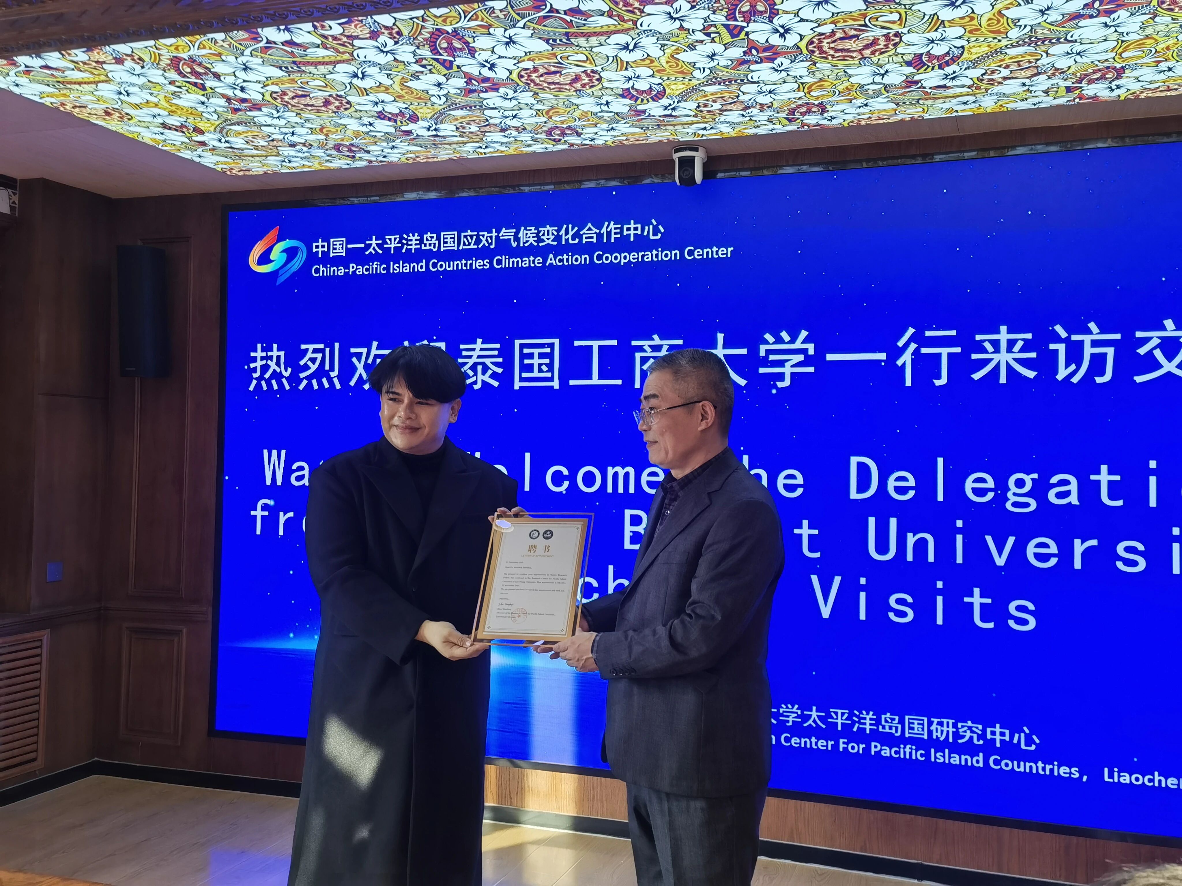 12月11日,泰国工商大学国际学院院长斯蒂丘克(Sittichok Jalernkij)率团访问9728太阳集团太平洋岛国研究中心,代表团成员包括副院长穆尚海、院长助理王晶晶及副院长助理邢国盛。双方围绕深化教育合作与交流等议题进行深入洽谈。9728太阳集团党委书记陈传利、副院长王作成,商学院副院长王金河、外国语学院副院长刘风山、国际教育学院副院长钱润池,太平洋岛国研究中心副主任刘建峰、梁甲瑞等共同参会。会议由王作成主持。 陈传利在致辞中代表学院对代表团的到来表示热烈欢迎,并从校史沿革、办学成就与特色专业等方面介绍了9728太阳集团的发展概况,重点阐述了太平洋岛国研究中心在建设历程、教学科研、人才培养等方面取得的成果。太平洋岛国研究中心副主任刘建峰详细介绍了中心的发展现状,分享了中心在推动跨学科融合、深化实地调研、促进校企合作等方面的经验与成绩。商学院、外国语学院及国际教育学院副院长分别结合各自学院的学科优势与发展规划,就与泰国工商大学开展合作交流、共建特色项目等话题进行了探讨。 斯蒂丘克院长介绍了泰国工商大学的办学历程与校训理念,着重阐述了学校在学科建设与国际化发展方面的特色,并分享了其在教育国际合作领域的经验与资源。他对太平洋岛国研究中心在服务国家战略、支持区域发展与学术研究方面取得的成果给予了高度评价。 穆尚海副院长进一步介绍了该校在人才培养与学科建设方面的优势。他指出,学校秉持“实践赋能+国际适配”双导向,构建了“理论教学+企业实训+跨文化实践”一体化培养体系,着力提升学生的跨文化沟通能力与岗位实践技能。学校聚焦酒店管理、国际教育等优势学科,打造了多层次课程体系与高水平科研团队,形成了学科特色鲜明、国际对接紧密的发展格局,并依托广泛的国际合作网络,可为两校联合培养与学术交流提供有力支持。 会上,陈传利向斯蒂丘克颁发聘书,聘任其为研究中心特约高级研究员。双方围绕合作办学模式创新、学术成果共享、学生联合培养等议题展开热烈讨论。双方一致认为,两校在办学理念与发展需求上高度契合,合作前景广阔,并表示将以此次交流为契机,深化多领域协作,共同培养具有国际视野的复合型人才。 来自外国语学院日语系主任林娜、商学院王腾博士参加座谈交流。